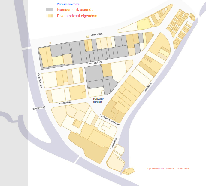 De gemeente heeft in de afgelopen jaren verschillende panden opgekocht. Desondanks is er op Overstad sprake van versnipperd eigendom. De versnipperde eigendomsstructuur levert het kader voor organisch ontwikkelen. Het ontwikkelkader biedt handvatten voor een organische gebiedsontwikkeling, waarbij de samenwerking tussen verschillende eigenaren centraal staat.