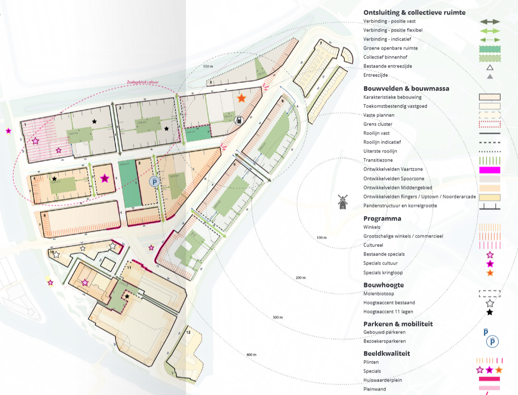 Hoofdstuk 4 beschrijft het ruimtelijk raamwerk. In hoofdstuk 5 wordt ingegaan op het te realiseren programma. Dit resulteert in een spelregelkaart met leidende principes voor deelgebieden en de gewenste beeldkwaliteit in hoofdstuk 6. De spelregelkaart dient als toetsinstrument bij de beoordeling van initiatieven en inrichting van de openbare ruimte. De spelregelkaart waarborgt de samenhang tussen de verschillende projecten. In hoofdstuk 7 wordt ingegaan op de gewenste beeldkwaliteit. Hoofdstuk 8 over de Ontwikkelstrategie beschrijft het ontwikkelproces, de fasering en de haalbaarheid van het plan.
