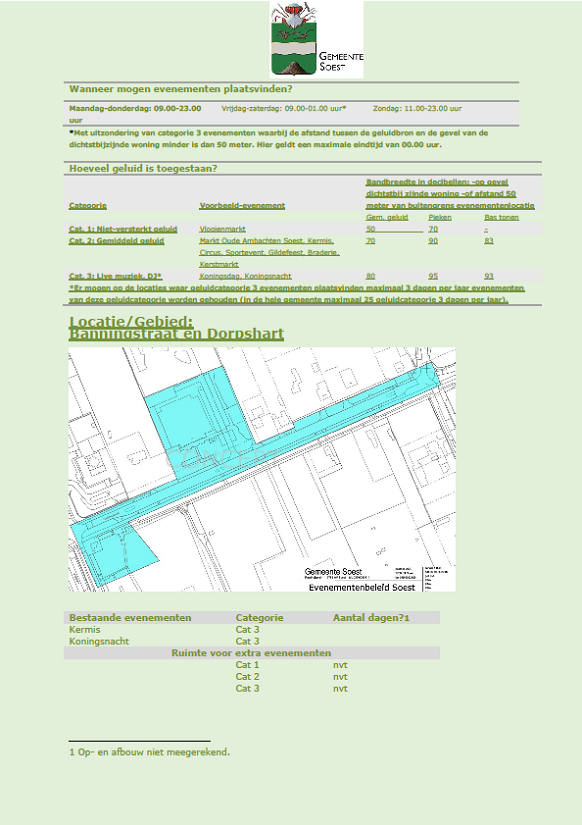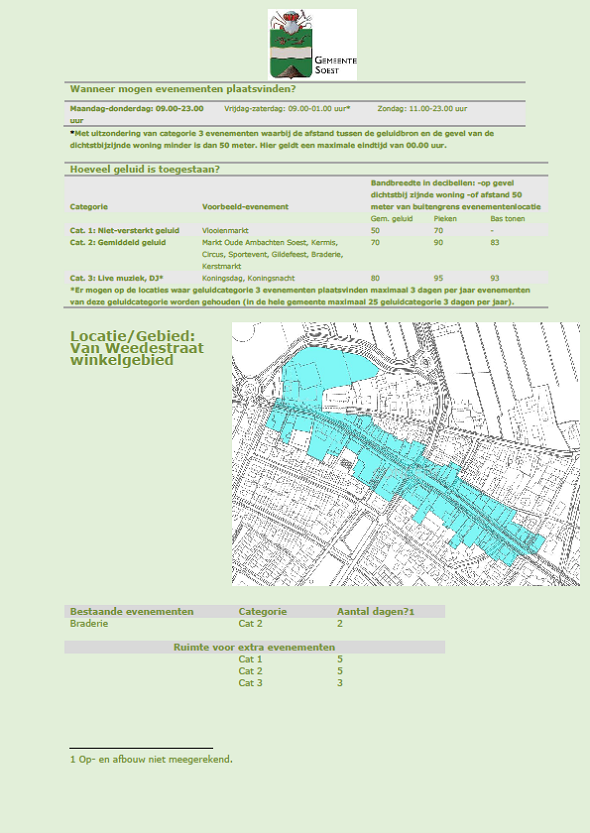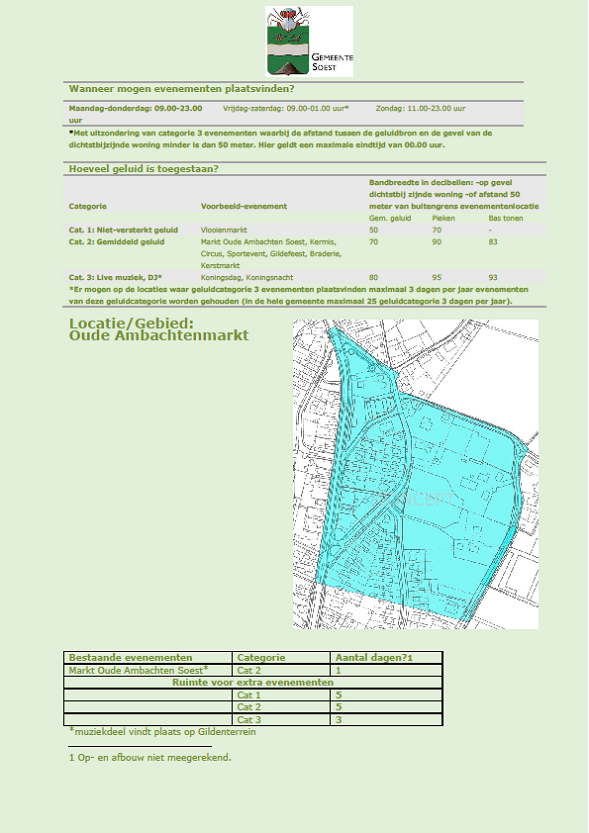 De gemeente heeft in 2012 en 2019 het geluidbeleid vastgesteld. Op 31 oktober 2018 is het Evenementenbeleid gemeente Soest in de lokale krant gepubliceerd en deze is op 10 september 2019 onder nr. 219681 in het gemeenteblad gepubliceerd. De gemeenteraad van de gemeente Soest heeft het Beleidsplan “Veilige evenementen in een gastvrij Soest” in 2018 vastgesteld. De regels uit de genoemde beleidstukken zijn overgenomen en kunnen worden geïntegreerd in het omgevingsplan.