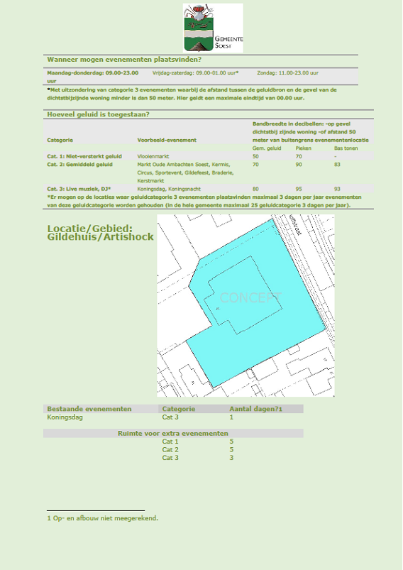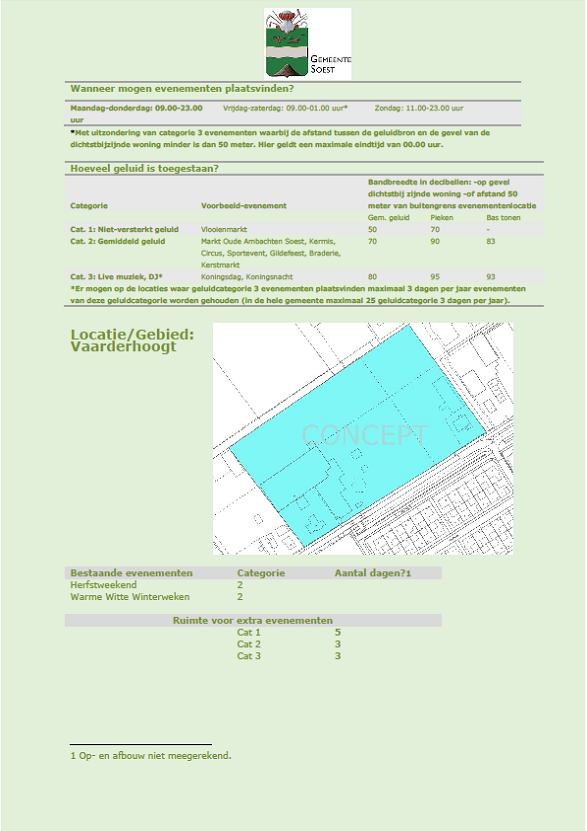 *2 Het aantal dagen van een evenement zijn bepalend dus niet het evenement zelf. Voorbeeld: Een aanvraag voor een festival voor 2023, tijdsduur drie dagen. Op de eerste dag wordt er een braderie (geluidcategorie 2) gehouden. De tweede dag is er een popconcert (geluidcategorie 3 ) en de derde dag wordt het festival afgesloten met een concert (geluidcategorie 3 ). Het festival duurt drie dagen waarvan er twee als geluidcategorie 3 evenementdagen worden aangemerkt.