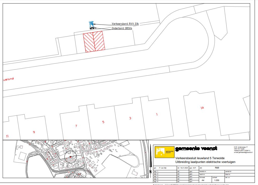met het plaatsen van verkeersbord E8c van bijlage 1 van het Reglement verkeersregels en verkeerstekens 1990 (parkeergelegenheid alleen bestemd voor het opladen van elektrische voertuigen), voorzien van het onderbord OB504 (geldt voor twee vakken) en het aanbrengen van belijning voor twee parkeervakken nabij het adres Ieuwland 5 in Terwolde te reserveren als parkeergelegenheid bestemd voor het opladen van elektrische voertuigen.