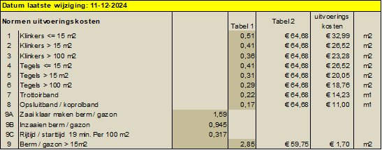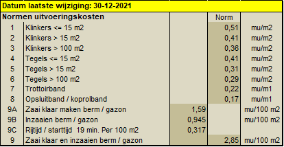 In tabel 1A zijn de normen (manuren per eenheid) opgenomen afgeleid van de GPKL.