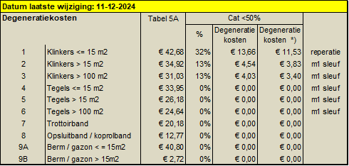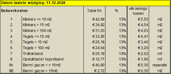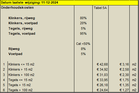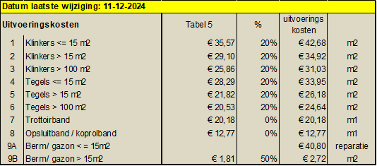 Bij tariefgroep A en D worden de eenheidsprijzen met ’n bepaald % verhoogd om ’n goede aansluiting op het bestaande straatwerk en bermen/gazon te kunnen realiseren, zie onderstaande tabel 5A.