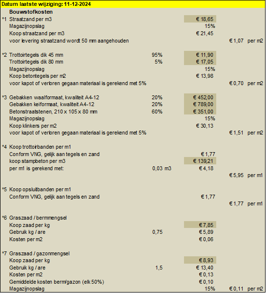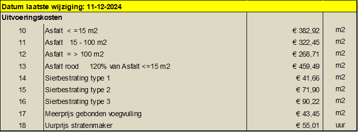 De kosten voor het straatwerk worden per m2 c.q. m1 berekend door de op het werk betrekking hebbende kosten van de navolgende kostensoorten te sommeren: