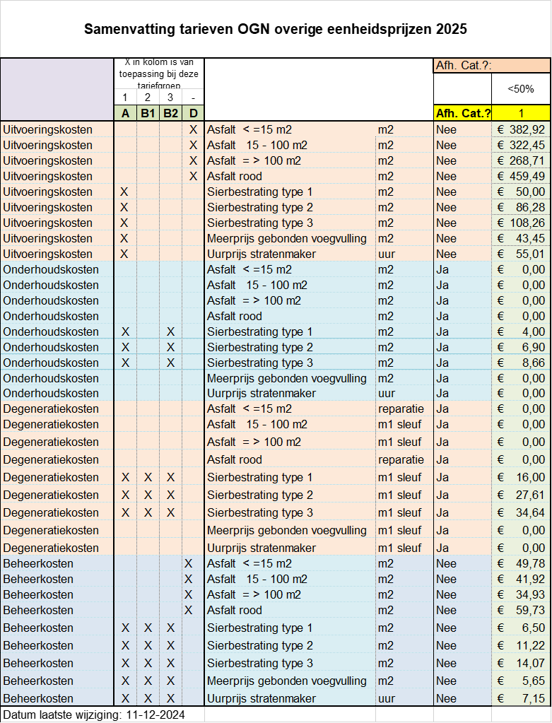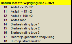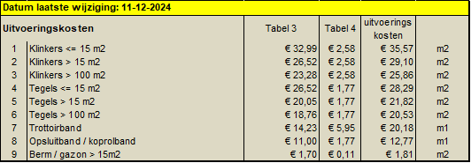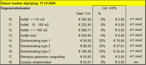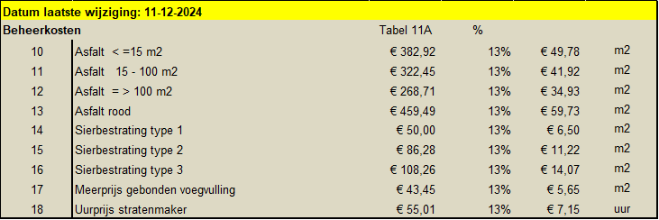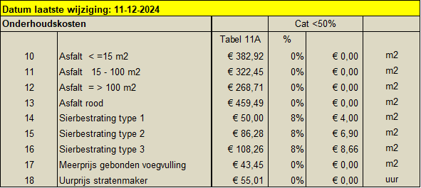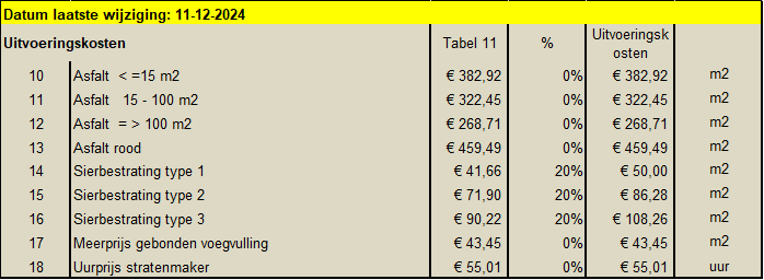 Bij tariefgroep A en D worden de eenheidsprijzen met ’n bepaald % verhoogd om ’n goede aansluiting op het bestaande straatwerk te kunnen realiseren, zie tabel 11A