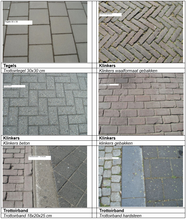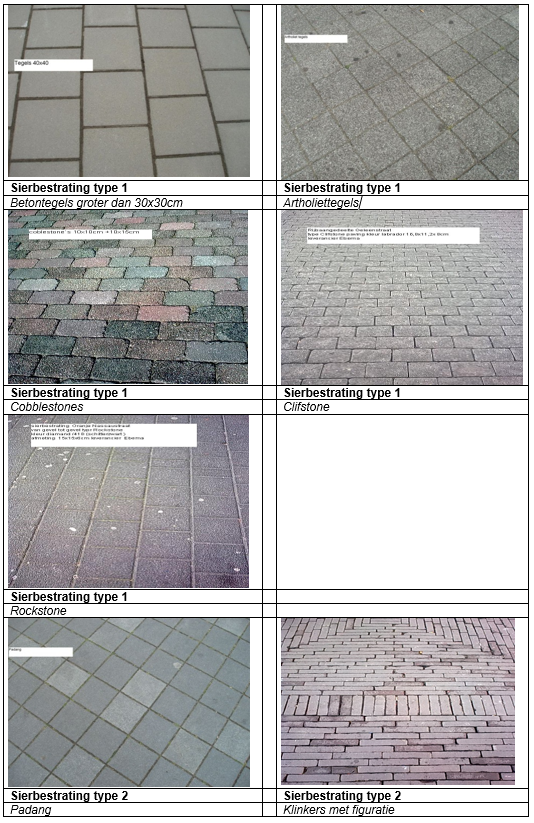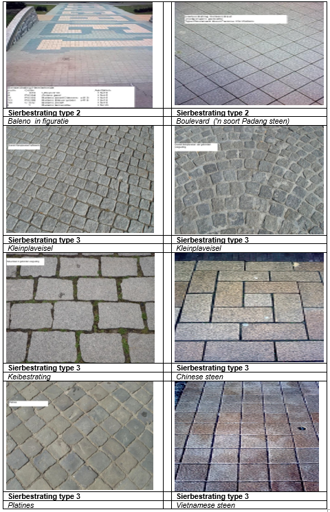 In bijlage 2 is d.m.v. foto’s duidelijk gemaakt welke soort bestrating onder sierbestrating type 1, 2 en 3 vallen.