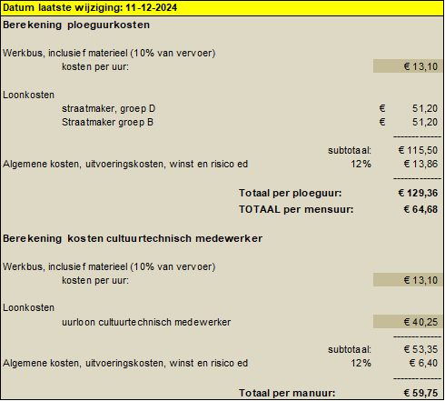 De uurloonkosten voor het herstellen van elementen, bermen en gazon zijn: