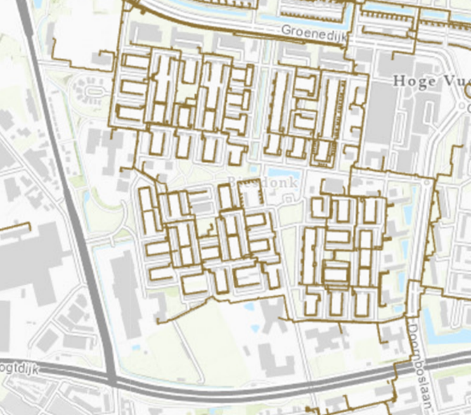 De CBS-buurtafbakening van Biesdonk is in afbeelding 3.1 weergegeven met een blauwe lijn. In de Transitievisie Warmte 2022 is gekozen voor een verkenningsgebied conform de gele lijn. Het uiteindelijke wijkenergieplangebied is weergegeven in rood. Dit plangebied loopt in het noorden tot aan de Groenedijk en in het zuiden tot aan de Nieuwe Kadijk. De oostelijke grens van het gebied is de Doornboslaan. De westelijke grens van het gebied loopt globaal langs de Hamdijk en de Luikstraat. Bepaalde type bebouwing is daarbij buiten het gebied gelaten. Hieronder staat toegelicht welke panden dit zijn en waarom ze niet tot het plangebied behoren.