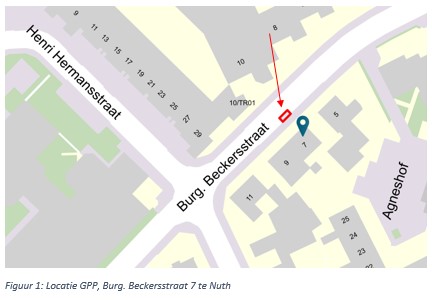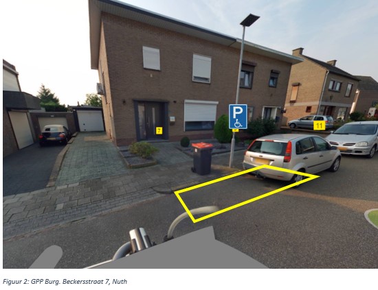Door het plaatsen van het bord E6 van Bijlage I van het RVV 1990 en onderbord OB309 (met kenteken) als bedoeld in artikel 8 van het BABW aan te wijzen als individuele invalidenparkeerplaats als bedoeld in artikel 26 van het RVV 1990 in de Burg. Beckersstraat te Nuth ter hoogte van huisnummer 7 (zie situatieschets);