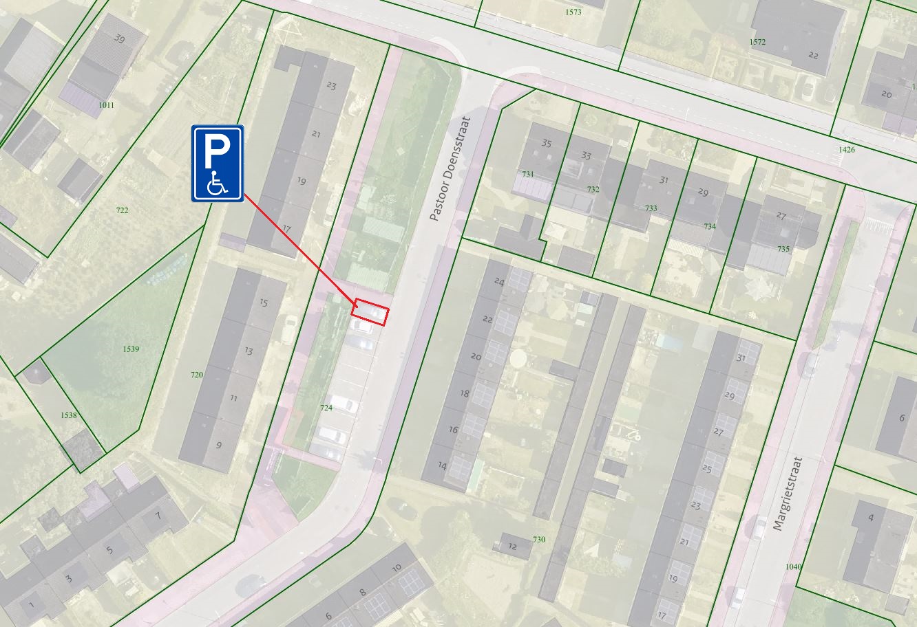 dat de gevraagde gehandicaptenparkeerplaats ingesteld kan worden als aangegeven op bijgaande tekening, op het bewuste parkeervak voor de woning in de Pastoor Doensstraat te Heikant, door bord E6 van bijlage I behorende bij het “Reglement Verkeersregels en Verkeerstekens 1990” met onderbord te plaatsen waarbij het parkeren wordt verboden, met dien verstande dat het verbod niet geldt voor het motorvoertuig waarmee de aanvrager, zich pleegt te vervoeren dan wel waarmee hij vervoerd wordt;