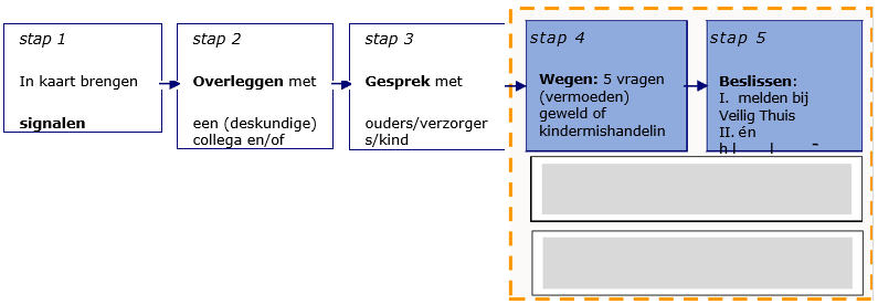 Onderstaand figuur toont de vijf stappen uit de Meldcode huiselijk geweld en kindermishandeling. Ter ondersteuning van de beslissingen in stap 5 is in stappen 4 en 5 een afwegingskader toegevoegd.