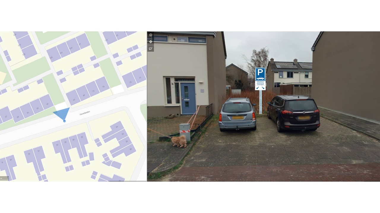 In de afbeelding hierboven is links, door een blauwe driehoek, te zien waar de laadpaal geplaatst wordt. Rechts kunt u zien welke twee parkeervakken gereserveerd worden. Voorlopig reserveren we maar één parkeerplaats voor het opladen van elektrische voertuigen.