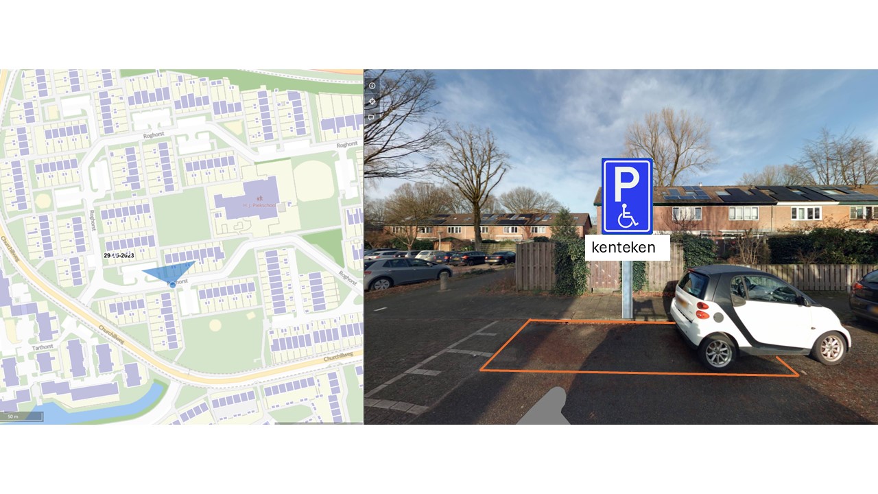 In de linker afbeelding hierboven staat een blauw driehoek die kijkt naar waar de gehandicaptenparkeerplaats ingesteld wordt. In de rechter afbeelding hoe de parkeerplaats er uit komt te zien.