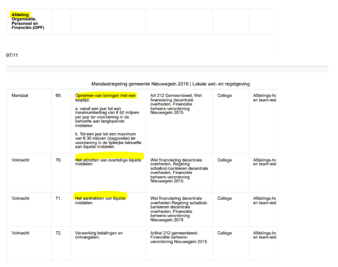 Voor het beheer van financieringsinstrumenten zijn de volgende mandaten vastgesteld: (conform de mandaatregeling)