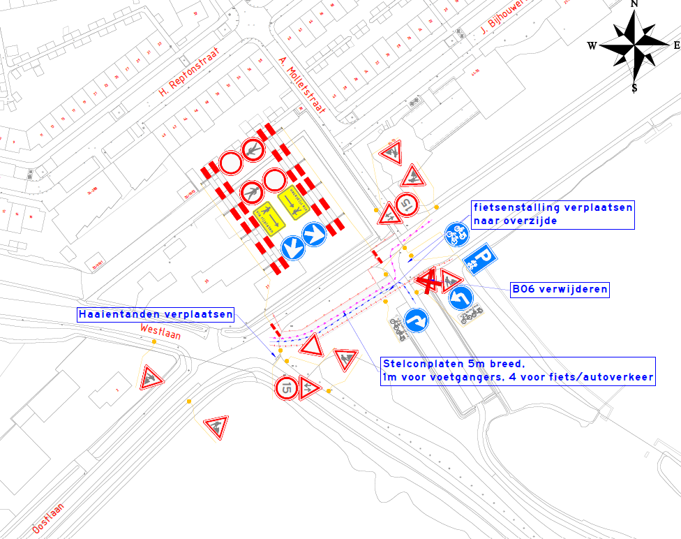De bouwwerkzaamheden worden aangeduid door middel van rood/witte waarschuwingshekken, verkeersbord J29 (tegenliggers), verkeersbord A01-015 (maximum toegestane snelheid 15 km/h) en verkeersbord J16 (werk in uitvoering) op verschillende locaties (lees: kruising Westlaan, en op het verlichte brom-/bromfietspad nog voor de werkzaamheden en bij het verlaten van de parkeerplaats).
