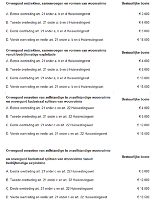Vereenvoudiging van de boetetabel voor onvergund(e) onttrekken, omzetten, vormen van woonruimte of kadastraal splitsen. Aanpassing van de boetebedragen aan jurisprudentie.
