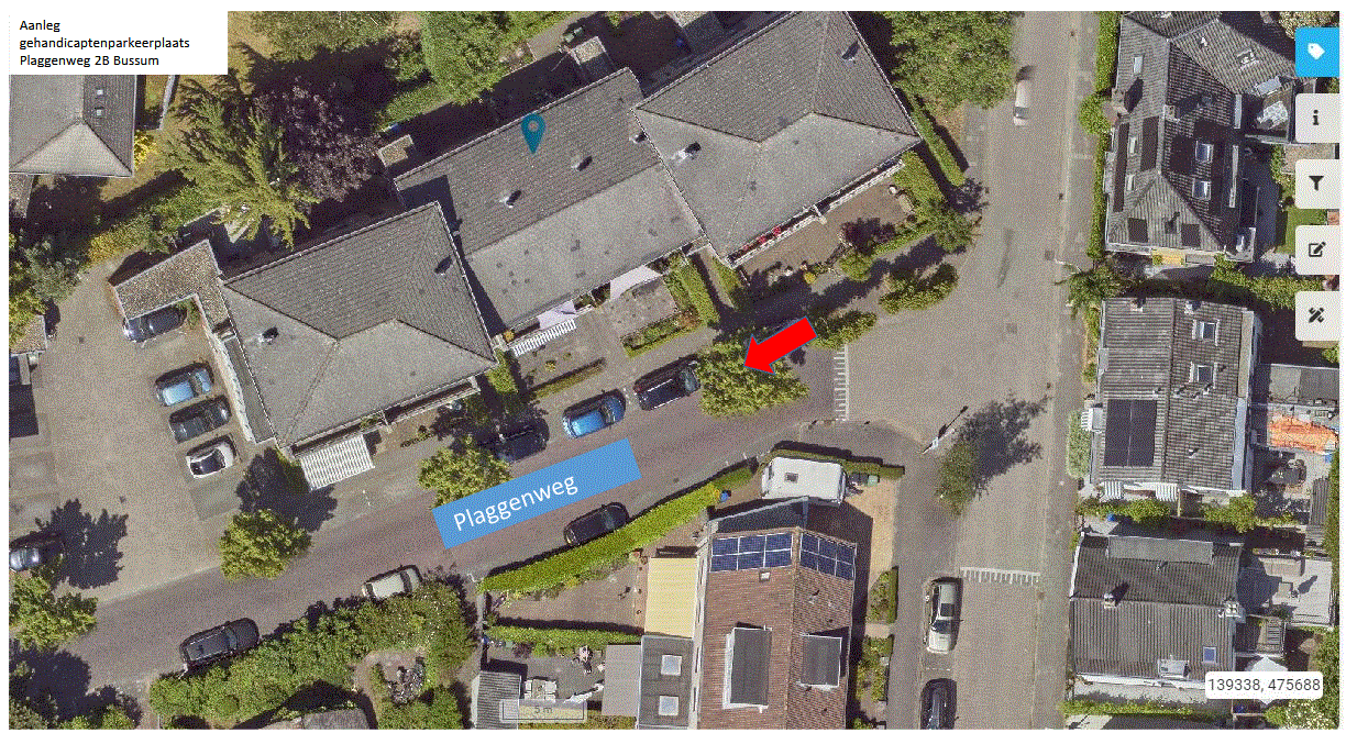 De gemeente Gooise Meren heeft naar aanleiding van een verzoek van een bewoner besloten om met behulp van een kenteken een gehandicaptenparkeerplaats voor de bewoner te reserveren ter hoogte van de woning met het adres Plaggenweg 2B, 1406SE Bussum. Op de situatietekening staat de beoogde locatie van de te reserveren parkeerplaats weergegeven.
