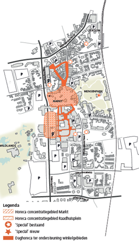 In en rondom het centrum zijn in de Centrumvisie 2017 een aantal plekken met horeca als ‘specials’ benoemd, omdat ze een specifieke plek versterken (zie afbeelding 4.3.1). Dit zijn het Matisseplein, de Westerstraat, de horeca aan de Stationsstraat, de hoek Wilhelminastraat en Kapelstraat en het Rensenpark.