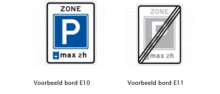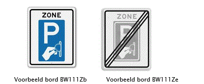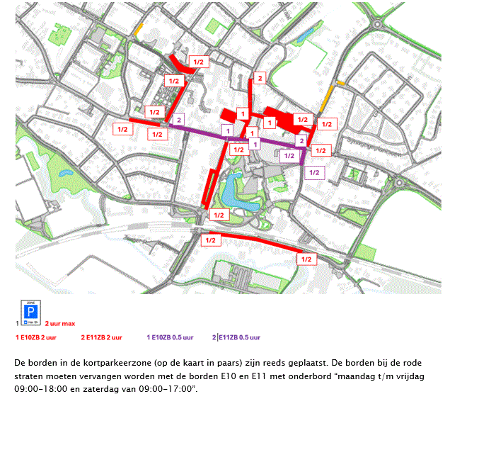 De bestaande borden BW111 Zb en BW111 worden vervangen door de borden E10 en E11 met een onderbord waarop staat “ma t/m vr 09.00-18.00 uur za 09.00-17.00 uur”.