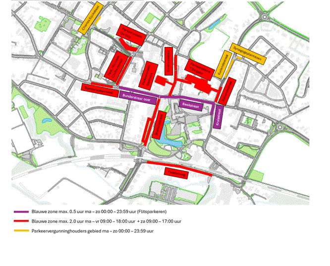 Op de Parallelweg is reeds een blauwe zone van kracht op maandag tot en met vrijdag van 08.00-17.00 uur met een parkeerduur van maximaal 1 uur. De blauwe zone op de Pastoor Nicolaas Creftenstraat en de Bunderstraat (tussen de Charles Eijckstraat en de Pastoor Nicolaas Creftenstraat) is van 08.00-17.00 uur met een parkeerduur van 1,5 uur. De blauwe zone bij gemeenschapshuis de Stip (parkeerterrein Pastoor Dominicus Hexstraat) is van 08.00-15.00 uur met een parkeerduur van 2 uur. Deze drie zones liggen aangrenzend of in de nabijheid van het centrum.