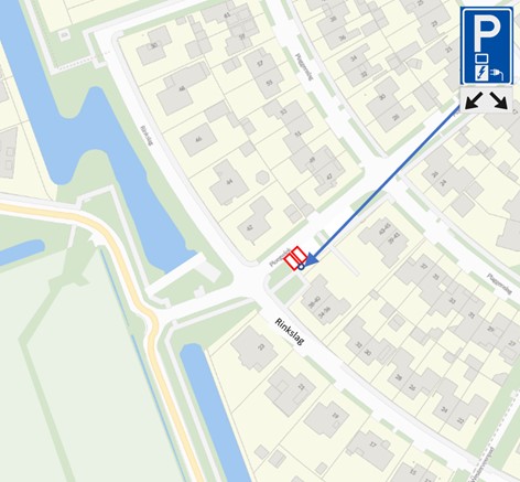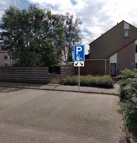 1. Door middel van het plaatsen van het bord E8c van bijlage 1 van het Reglement Verkeersregels en Verkeerstekens 1990 met een onderbord (OB504) die met twee pijlen aangeeft op welke vakken het betrekking heeft, twee parkeerplaatsen te reserveren ten behoeve van het opladen van elektrische voertuigen op de volgende locatie: