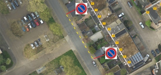 - met behulp van het plaatsen van de verkeersborden E1 van bijlage 1 van het RVV 1990 in combinatie met een fysieke maatregel in de vorm van een gele onderbroken streep het parkeren over een lengte van 35 tot 40 meter te verbieden;