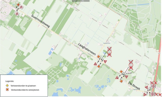 ● tegelijkertijd middels het plaatsen van borden B3, B4 of B5 van bijlage 1 van het RVV 1990 de navolgende kruispunten worden aangewezen als voorrangskruispunt waarbij bestuurders komende uit de kruisende zijwegen voorrang dienen te verlenen aan bestuurders die zich bevinden op De Streek, Laaghalerveen en Suermondsweg: