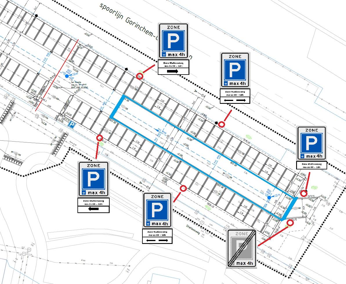 Het instellen van een blauwe zone door middel van één E11 en vijf E10 borden met onderbord “zone Stationsweg ma t/m zo 09 – 18 h” en een onderbord met een pijl. Ook worden de 38 parkeervakken aangeduid met blauwe belijning.