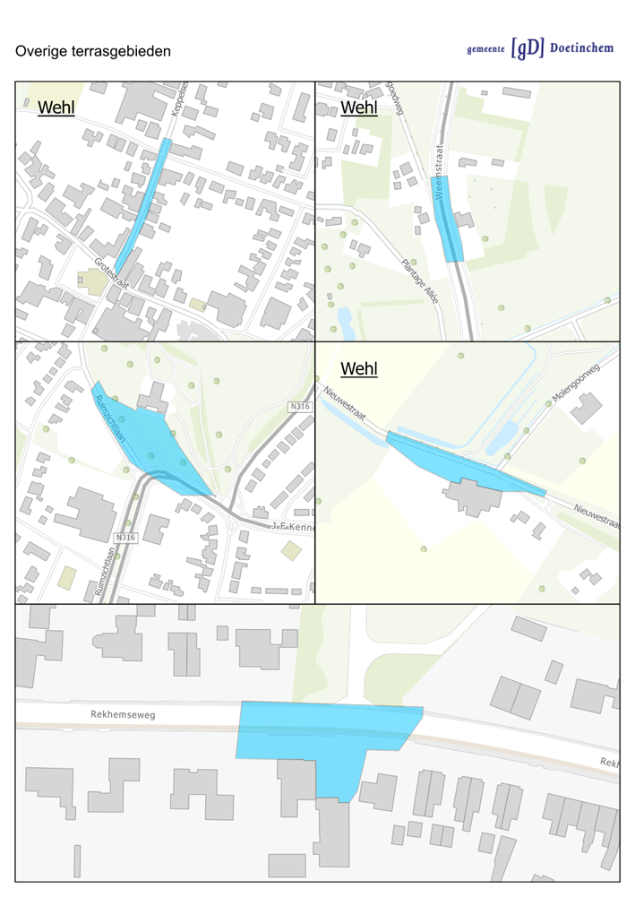 In de gemeente Doetinchem kennen we drie soorten terrassen in de openbare ruimte en één soort op eigen terrein. Hieronder volgen eerst de drie soorten terrassen in de openbare ruimte: