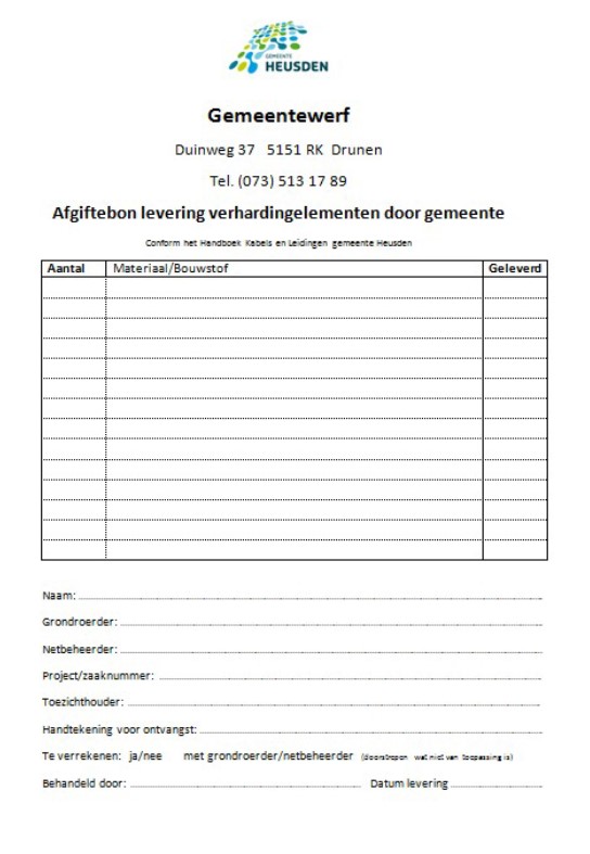 Soms wordt er door (de aannemers van) de netbeheerders en/of grondberoerders met de Gemeentewerf op de Duinweg 37 te Drunen contact opgenomen voor het ophalen van verharding- elementen en/of ander bouwstoffen.