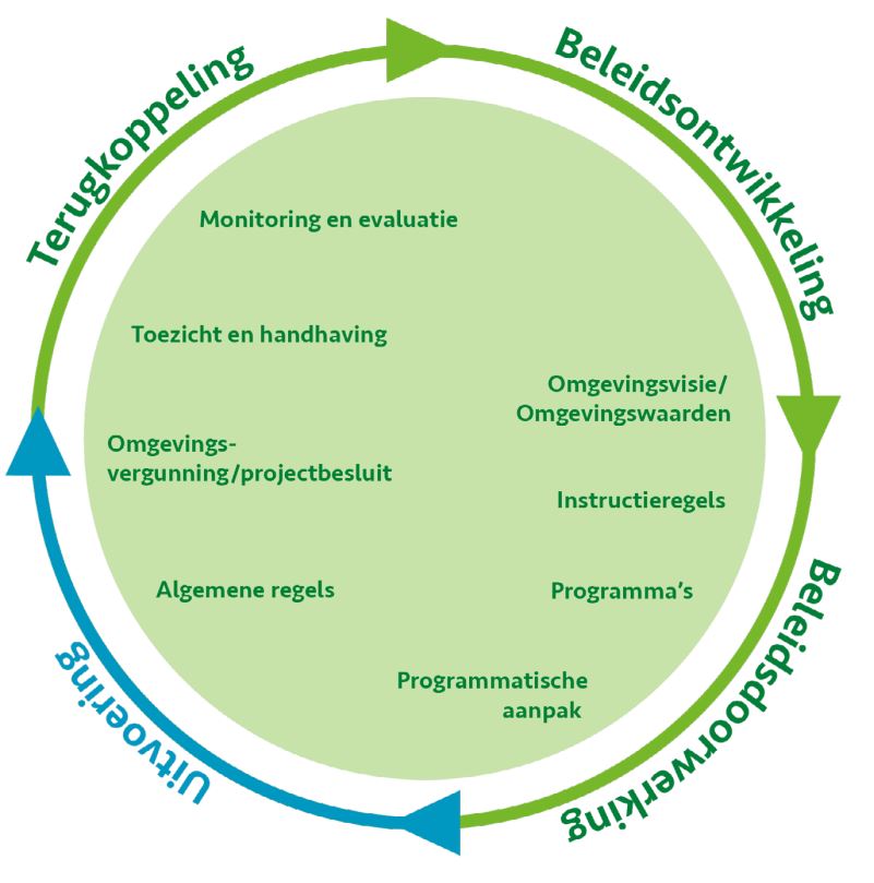 De Omgevingsvisie is de basis voor ruimtelijke beleidsontwikkeling. Het vormt de grondslag voor al het gemeentelijk beleid met betrekking tot de fysieke leefomgeving, vanuit integraal perspectief bekeken. Richtinggevende keuzes en uitspraken uit de visie werken door in verdere beleidsontwikkeling, uitvoering en terugkoppeling. Ze komen terecht in verschillende instrumenten. Denk aan instrumenten als programma’s, het omgevingsplan (=algemene regels), omgevingsvergunningen en aanbestedingen. Het schema geeft de beleidscyclus weer en het instrumentarium per fase.