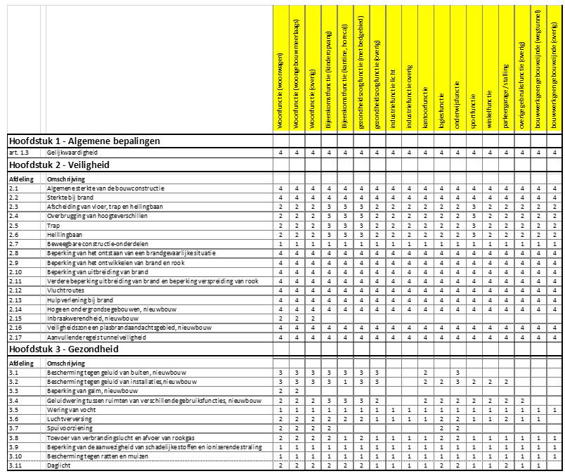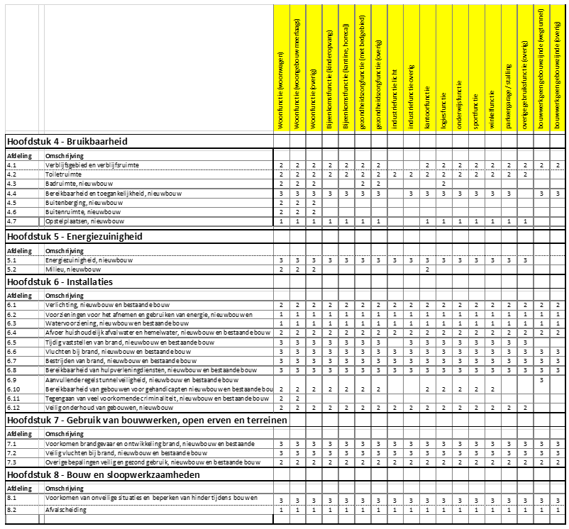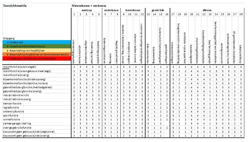 Uit de matrix blijkt dat het om verschillende fasen in het bouwproces gaat en dat op een groot aantal onderdelen is aangegeven met welke diepgang de controle plaatsvindt. Het verder uitwerken van het exacte controleniveau kan door middel van checklisten. Daarin kan gedetailleerder worden benoemd waarop gecontroleerd dient te worden en per inspectie kan de inspecteur vastleggen waarop is gecontroleerd en met welke mate van diepgang.