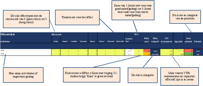 Elke activiteit bevat een score op de effecttypen van 0 (geen effect) tot 5 (erg groot effect). en de kans van 1 (komt niet voor, zeer goed naleefgedrag) tot 5 (komt vaak voor, beperkt naleefgedrag). Voor elke activiteit is het gemiddelde effect bepaald en vermenigvuldigd met de kans. Dit geeft de risicoscore. Die is berekend door 2x het gemiddelde effect te vermenigvuldigen met de kans. Vervolgens zijn de scores ingedeeld naar laag, gemiddeld en hoog.