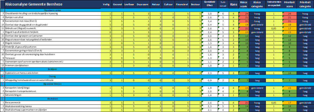 Op basis van de ‘Kans en Effect’ benadering volgt een risicoscore van activiteiten die in onze gemeente in de fysieke omgeving (kunnen) voorkomen. De risicoscore is beoordeeld op de mate waarin we met VTH-instrumenten invloed kunnen uitoefenen op de activiteiten en de capaciteit die ingezet kan worden. Dit leidt tot onze prioriteiten. De methode is als volgt toegepast: