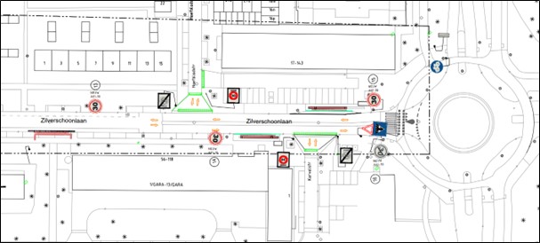 op de Zilverschoonlaan in oostelijke richting na het passeren van de kruising met de Hoefbladstraat;