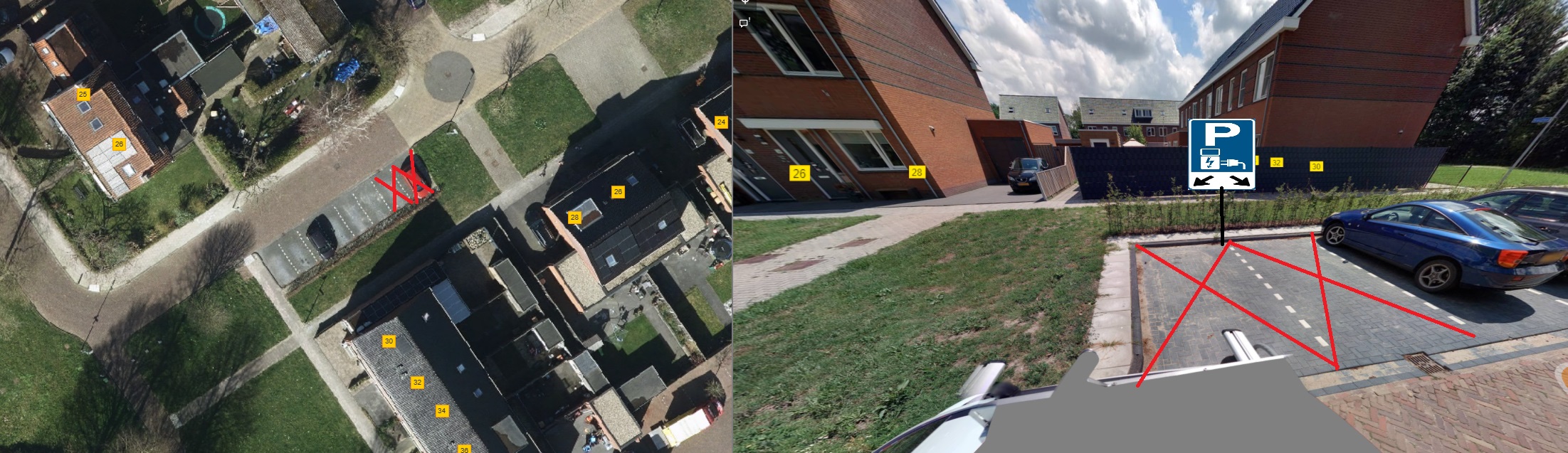 De laadpaal wordt geplaatst in het midden tussen twee parkeerplaatsen. Bij het kiezen van een nieuwe oplaadlocatie dient rekening gehouden te worden met de volgende criteria: