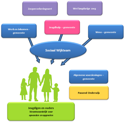 Indien een specifieke vorm van ondersteuning, hulp of zorg nodig is, dan is van belang dat duidelijk is wie daarvoor de verantwoordelijkheid draagt. Daarom bieden we met deze Verordening Jeugdhulp Zwolle 2025 een actueel en aangescherpt kader voor wat jeugdhulp is, wat de eigen verantwoordelijkheid van ouders is en welke afweging daarbij hoort. Tevens bakenen we jeugdhulp scherper af met Passend Onderwijs, de Wmo, Zorgverzekeringswet en de Wet langdurige zorg. Daarbij is de kernvraag niet ‘wat is jeugdhulp’, maar gaat het om de vraag op grond van welk wettelijk kader een vorm van ondersteuning, hulp of zorg beschikbaar is en wie daarvoor verantwoordelijk is. Zie ter illustratie ook onderstaande figuur, waarin de verschillende domein zijn weergegeven.