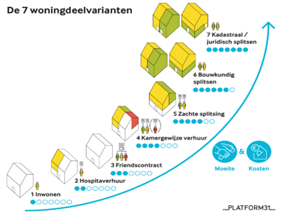 Voor woningdelen en splitsen zijn verschillende varianten mogelijk, oplopend in complexiteit en kosten (figuur 9). In de praktijk zien we vooral kansen voor woningdelen, meer dan splitsen en optoppen.