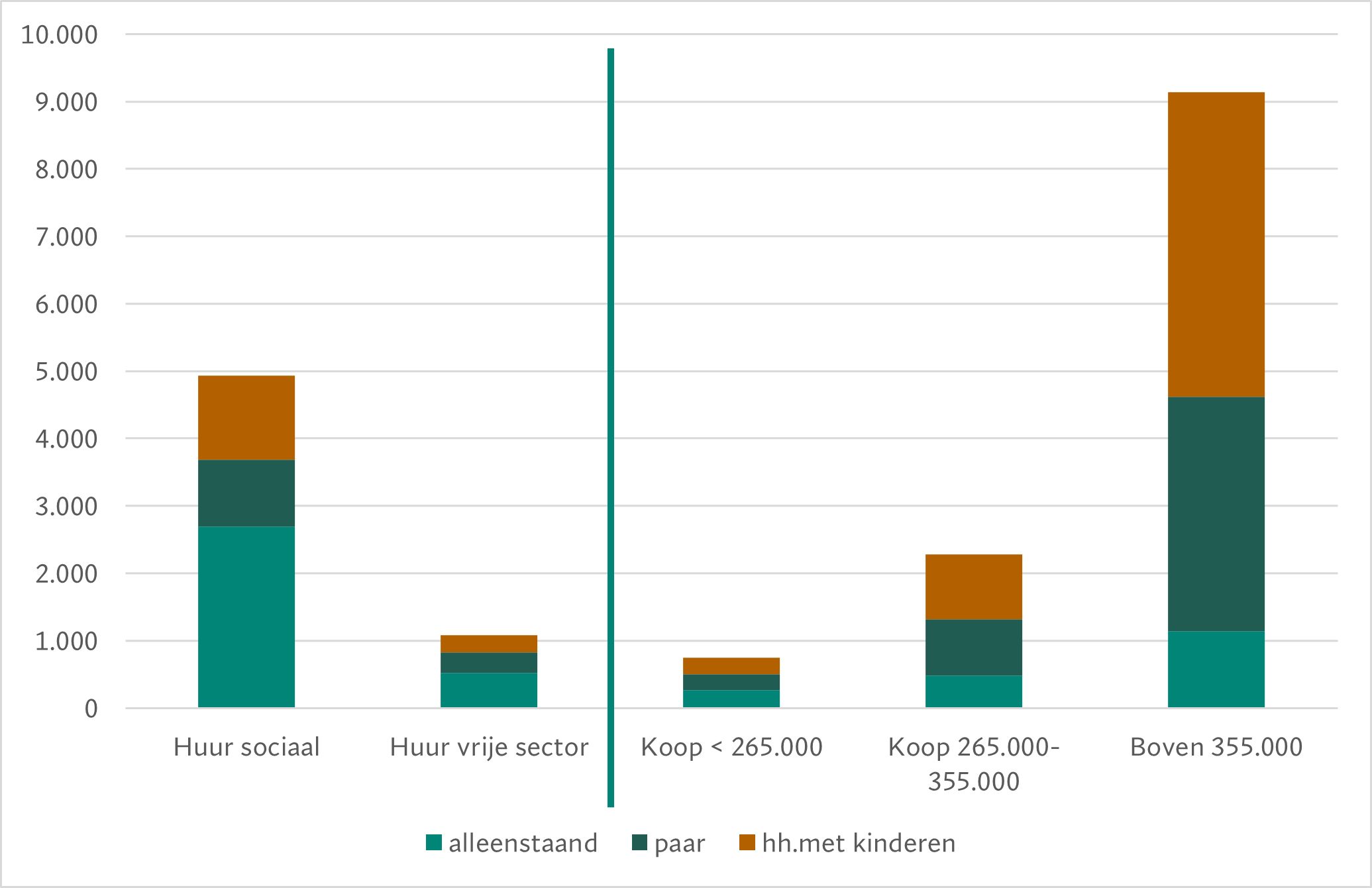 In dezelfde figuur zien we dat stellen en huishoudens met kinderen vooral in de dure koop wonen, terwijl in de sociale huur meer alleenstaanden wonen.
