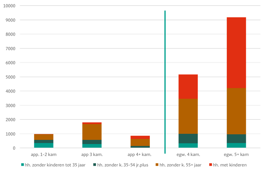 Te zien is dat huishoudens met kinderen vooral in de ruime eengezinswoningen wonen. Maar omgekeerd valt ook op dat in meer dan de helft van de (ruime) eengezinswoningen huishoudens zonder kinderen wonen. Voor een groot deel zijn dit 55-plussers, vaak ‘empty-nesters’ waarvan de kinderen het huis uit zijn gegaan.