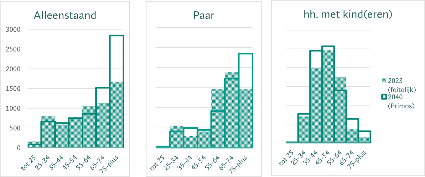 Het aantal huishoudens in onze gemeente groeit tot 2040. Figuur 3 laat zien dat de groei gepaard gaat met flinke vergrijzing: het aandeel 65-plussers stijgt, zowel onder de alleenstaanden als de (echt)paren. Het aantal jongeren neemt licht af en er komen meer (jonge) gezinnen bij in onze gemeente.