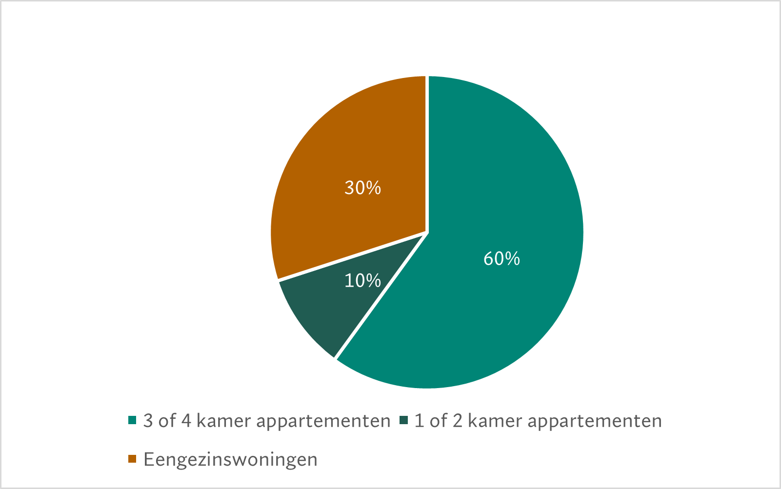 We bouwen woningen die voor doorstromers aantrekkelijk zijn om in te wonen. Dat zijn met name drie- of vierkamerappartementen, met goede buitenruimte en gelijkvloers. Voor het nieuwbouwprogramma tot en met 2030 ligt de verdeling in woningtypen al grotendeels vast (met ongeveer de helft grondgebonden woningen en de helft appartementen). Voor de nieuwbouw daarna houden we als richtlijn de onderstaande verdeling aan.