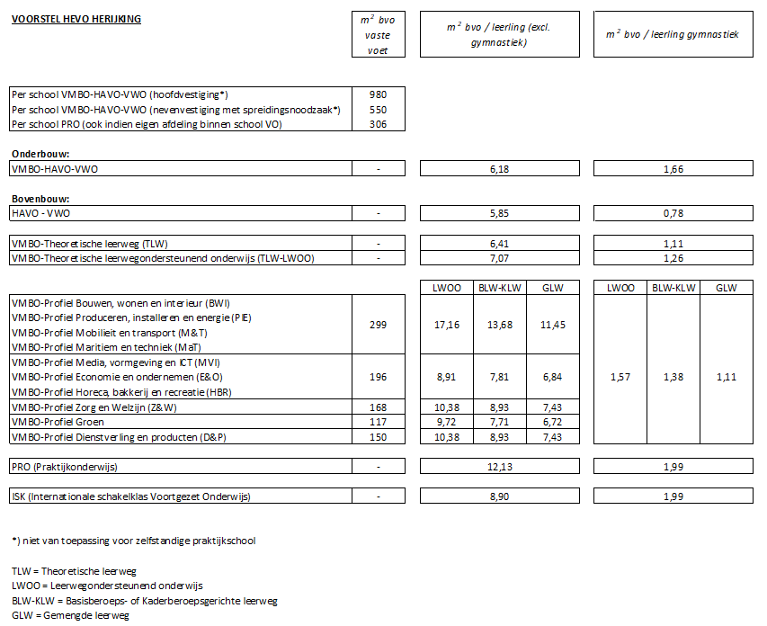 De ruimtebehoefte voor een school voor basisonderwijs, een school voor speciaal onderwijs of voortgezet speciaal onderwijs en een school voor voortgezet onderwijs wordt gebaseerd op het aantal leerlingen vermenigvuldigd met een m2 bruto vloeroppervlakte per leerling. Een school voor voortgezet onderwijs maakt daarnaast aanspraak op een vaste voet, die afhankelijk is van: