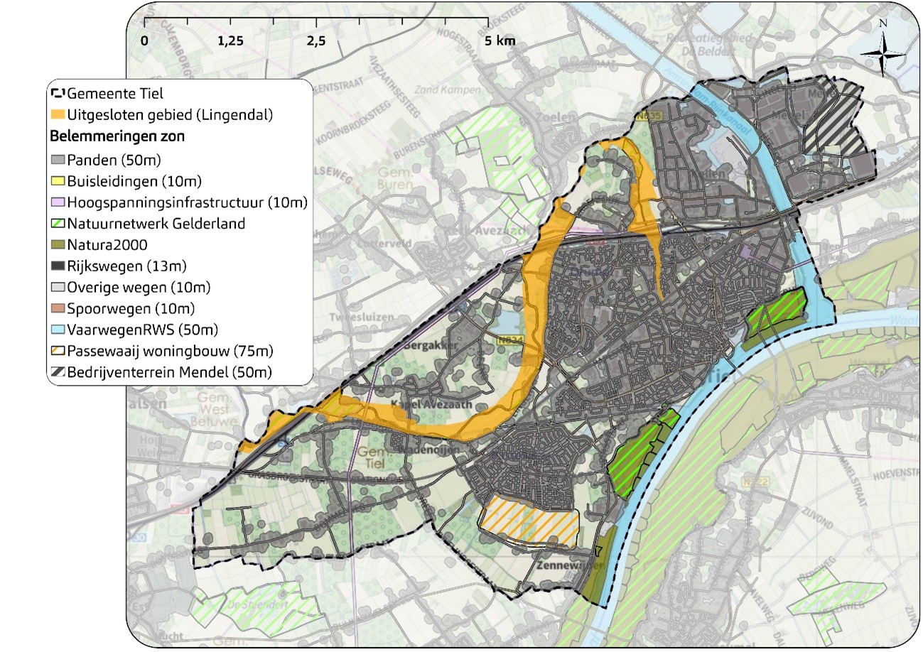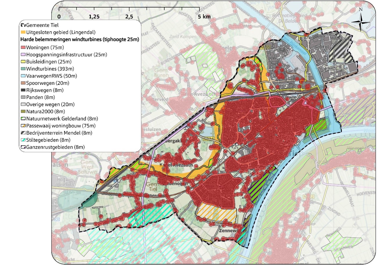 Rondom ruimtelijke (harde) belemmeringen die zich in of nabij de gemeente Tiel, zijn minimale afstanden aangehouden die volgen uit wet- en regelgeving. Deze afstanden worden beschreven in Bijlage B. Bij de analyse is uitgegaan van een windturbine met een ashoogte van 17 meter er een rotordiameter van 16 meter (tiphoogte: 30 meter). Figuur 9 laat de belemmeringen voor plaatsing van kleine windturbines zien die aanwezig zijn in de Gemeente Tiel.