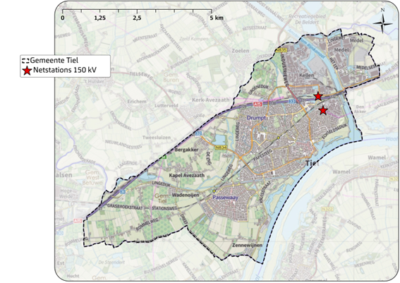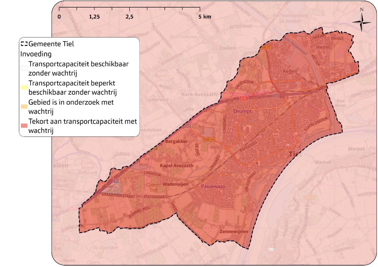 Opgewekte duurzame elektriciteit wordt via het elektriciteitsnetwerk getransporteerd. De beheerders van dit elektriciteitsnetwerk in Tiel zijn TenneT (landelijk, hoogspanningsnetwerk) en Liander (regionaal, midden- en laagspanningsnetwerk). De huidige (2024) capaciteit op het elektriciteitsnetwerk is zeer beperkt en dit zal voorlopig ook zo blijven. Dit blijkt ook uit figuur 12 waaruit blijkt dat er in grote delen van Tiel geen ruimte op het net is voor invoeding (teruglevering) van elektriciteit. Uitbreiding is kostbaar en kent lange doorlooptijden maar is zeer noodzakelijk.