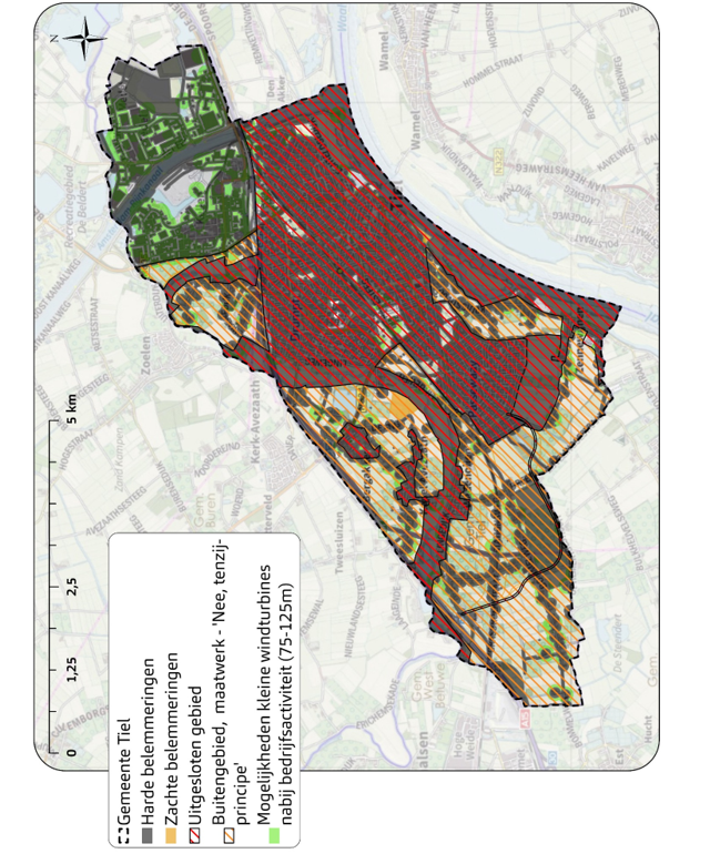 Figuur 10 Belemmeringenkaart voor kleine windturbines op basis van ruimtelijke belemmeringen en landschappelijke beperkingen in de gemeente Tiel.