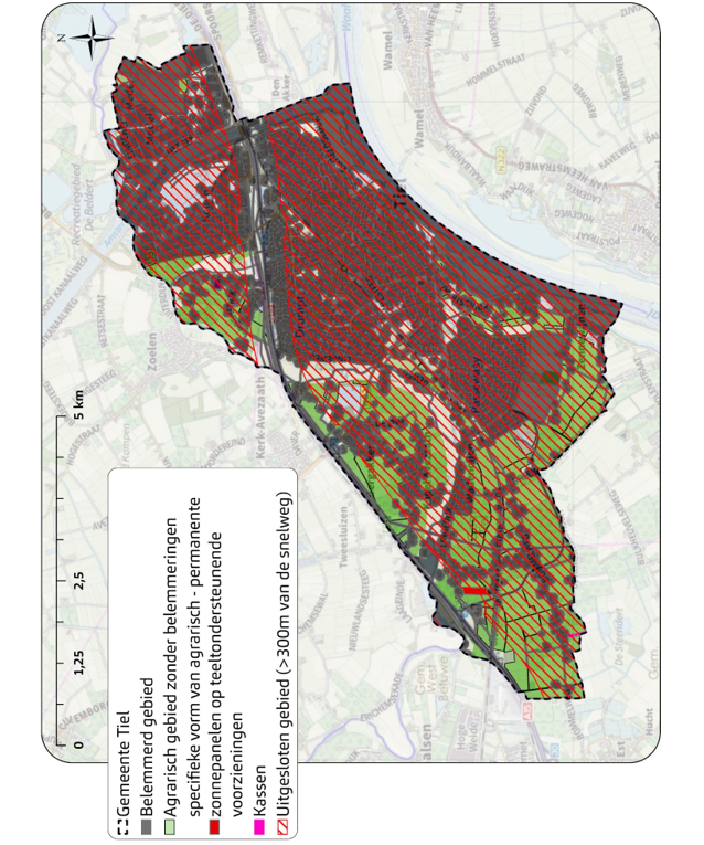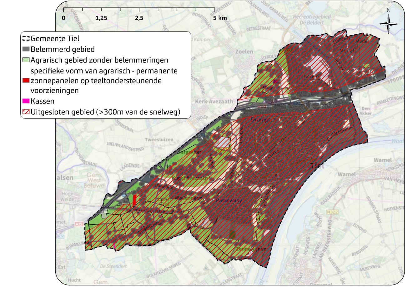 Voor grondgebonden zonneparken en Agri-PV is een belemmeringenanalyse uitgevoerd om de mogelijkheden inzichtelijk te maken. In tegenstelling tot windenergie is het belemmerde gebied voor zonnevelden en Agri-PV in Tiel niet een gevolg van dat voldoende afstand tot verschillende objecten (zoals woningen) en bestemmingen (zoals een vaarweg) moet worden aangehouden maar meer het feit dat betreffende objecten en bestemmingen in het gebied liggen en daarom op deze plek geen zonnepark kan worden gerealiseerd. Daarnaast is de landschappelijk inpassingsmogelijkheid als streng criterium meegenomen. De gemeente Tiel wil zeer terughoudend omgaan met het plaatsen van zonnepanelen in het openlandschap in het buitengebied. Daarom is ervoor gekozen om grondgebonden zonneparken en Agri-PV alleen toe te staan in een strook van 300 meter aan beide zijden van de A15.