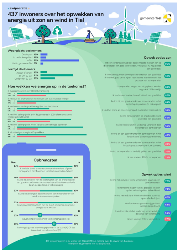 Deze volgorde is onder andere vastgesteld op basis van de inwonersconsultatie die in aanloop naar de RES heeft plaatsgevonden. De uitkomsten daarvan zijn per gemeente inzichtelijk. Het draagvlak voor zonne-energie conform de volgorde uit de RES in de gemeente Tiel is groot: 97% heeft een voorkeur voor zonnepanelen op (bedrijfs)daken, 87% voor zonnepanelen langs de snelweg en 75% is voorstander van een combinatie met landbouw. Met behulp van Swipocratie is dit eind 2022 verder getoetst. De uitkomsten zijn ook als bijlage bijgevoegd.