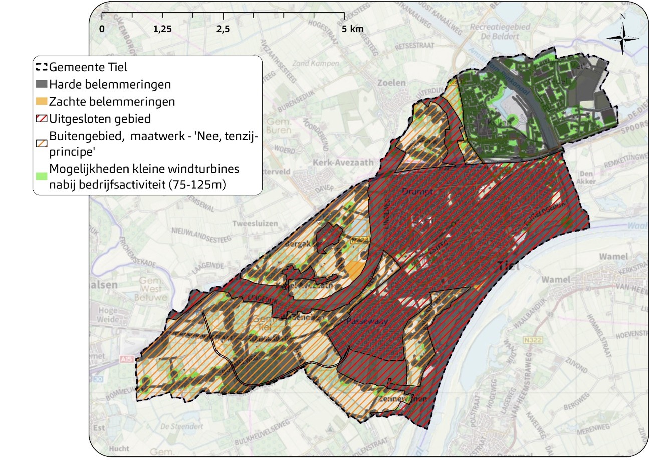 In figuur 1 is de kansenkaart weergegeven waarin de (nu van toepassing zijnde) harde en zachte belemmeringen zijn gecombineerd. In de praktijk kan blijken dat een gebied toch (deels) (on)geschikt is op basis van nadere praktijk onderzoek zoals een Omgevingseffect Rapportage, Herritage Impact Analyse en geluidsonderzoeken. Op de kansenkaart is te zien dat ten zuidwesten van de gemeente Tiel en ten zuiden van de Grasbroekstraat (onder voorwaarden) de enige beschikbare ruimte is voor grote windturbines (figuur 1).