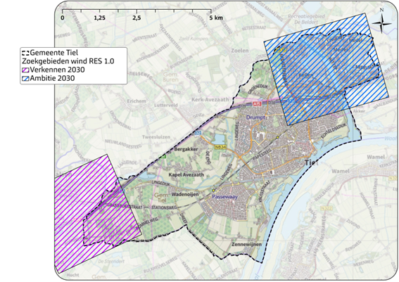 De gemeente Tiel realiseert het bod uit de RES door met initiatiefnemers in gesprek te gaan en de beleidsmatige randvoorwaarden voor een zorgvuldige inpassing van initiatieven vast te stellen. Initiatieven voor windenergie zijn alleen mogelijk binnen de in de RES aangeduide gebieden (figuur 5).